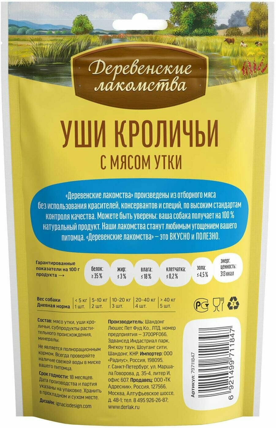 Деревенские лакомства для собак уши кроличьи с мясом утки 90г.