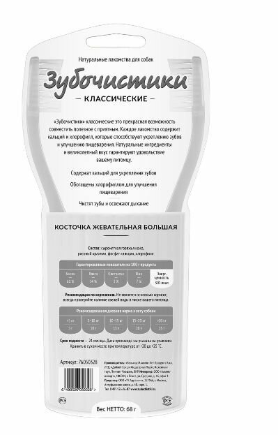 Зубочистики Классические Лакомство д/собак Косточка жевательная большая 1 шт 68 г