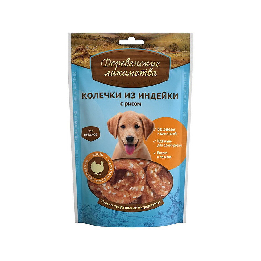 Лакомство Деревенские Лакомства мясные колечки из индейки, для щенков 85г интересное: