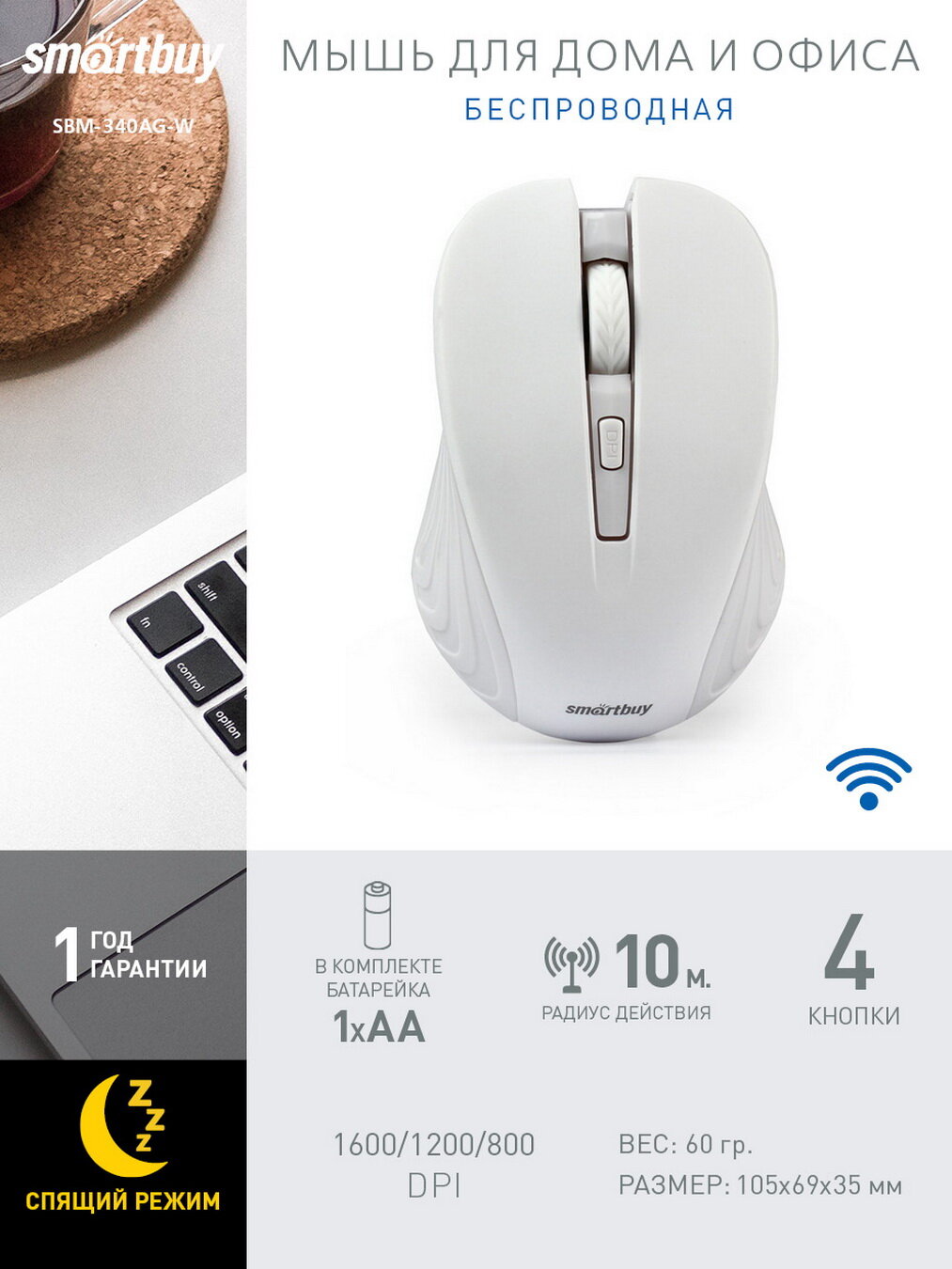 СохранитьМышь беспроводная Smartbuy ONE 340AG USB/DPI 800-1200-1600/4 кнопки/1AA белая (SBM-340AG-W) интересное: