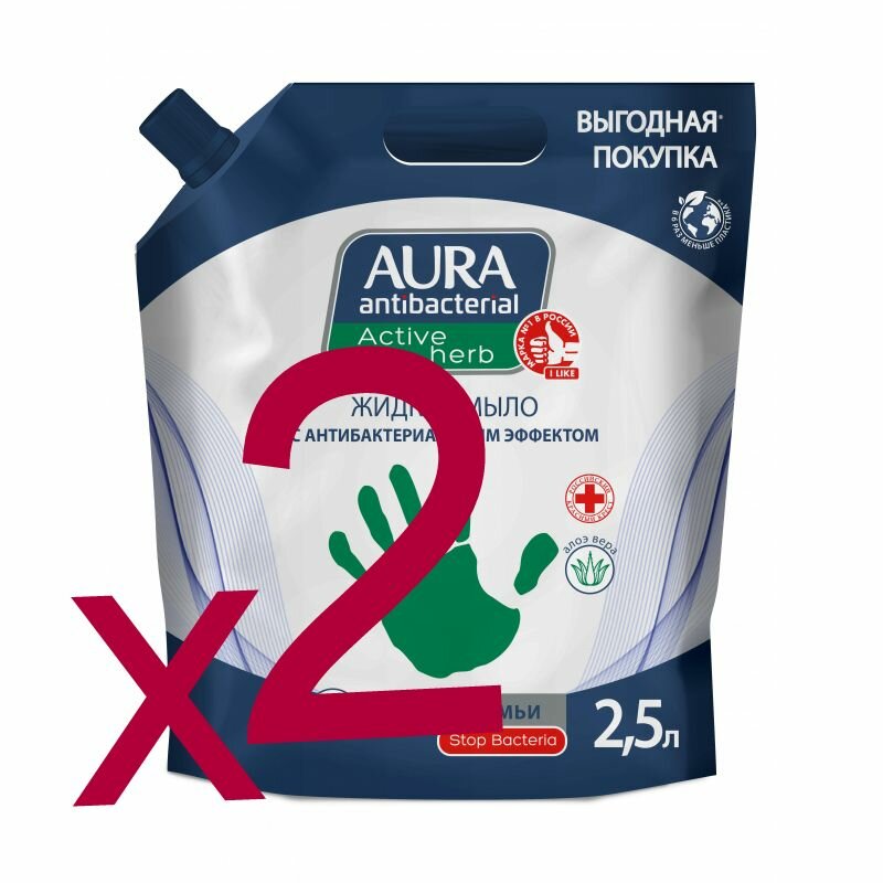 Мыло жидкое AURA Antibacterial c антибактериальным эффектом дой-пак 2,5л ( 2 шт).