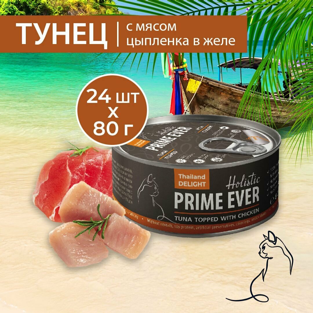 Влажный корм для кошек, тунец с цыпленком в желе, холистик, Prime Ever, упаковка 24 шт х 80 г