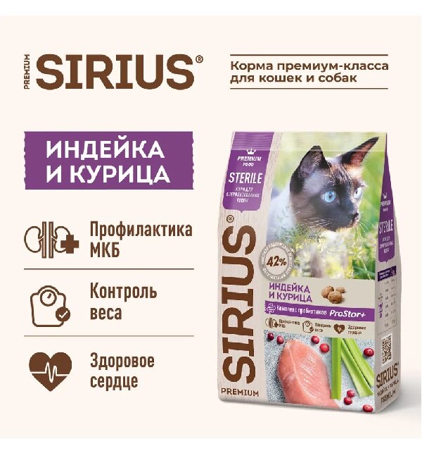SIRIUS (Сириус) сухой корм для ежедневного питания стерилизованных кошек индейка И курица 1,5 кг