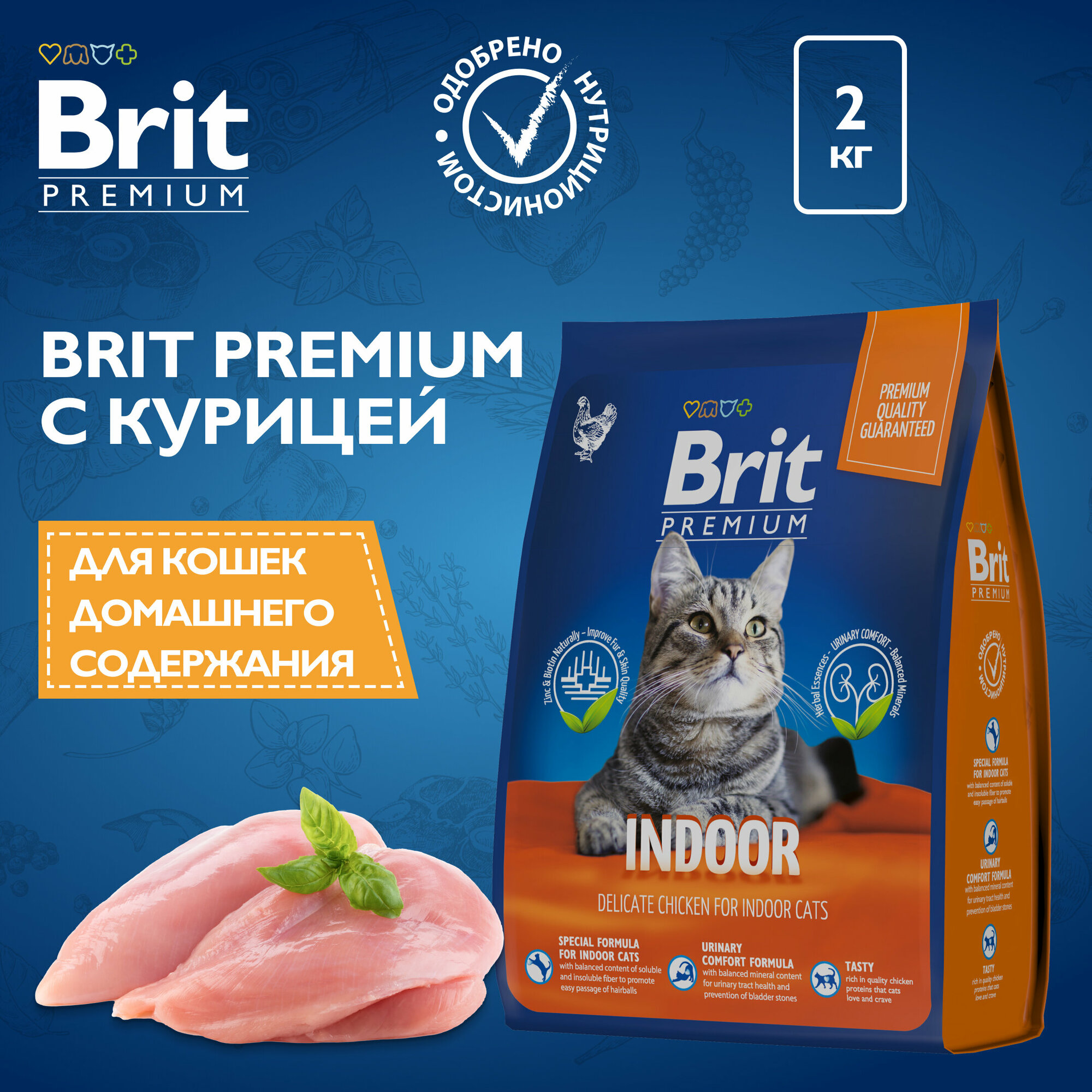 Корм сухой Brit Premium Cat Indoor для кошек домашнего содержания, с курицей 2 кг