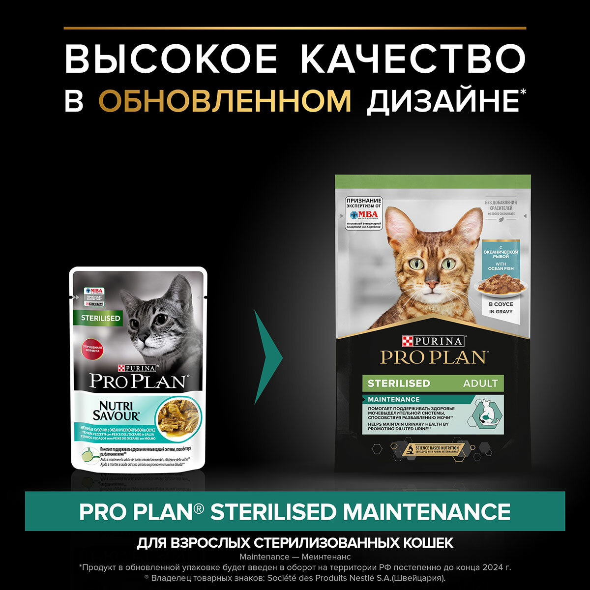 Влажный корм Pro Plan STERILISED для стерилизованных кошек и кастрированных котов, с океанической рыбой в соусе, паучи, 85г.*12шт.