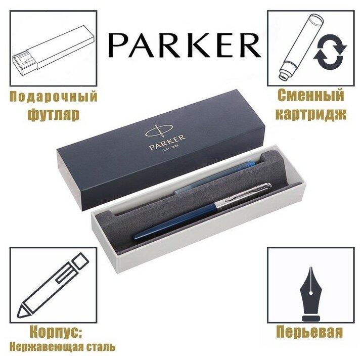 Ручка паркер перьевая подарочная Parker Jotter Royal Blue Ct, корпус синий, детали из нержавеющей стали, синяя, 142942