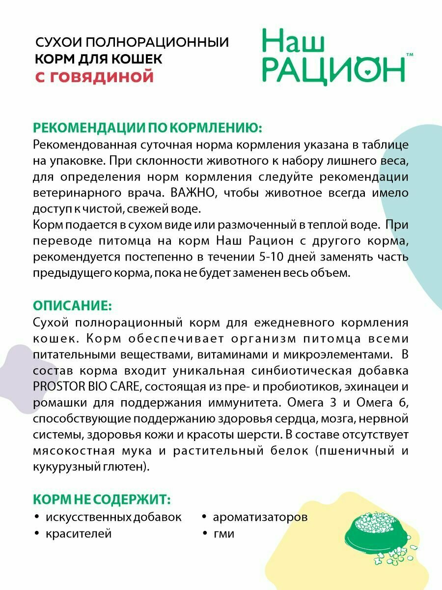 Корм сухой Наш рацион для кошек всех пород с говядиной, 2 шт. по 400 гр.