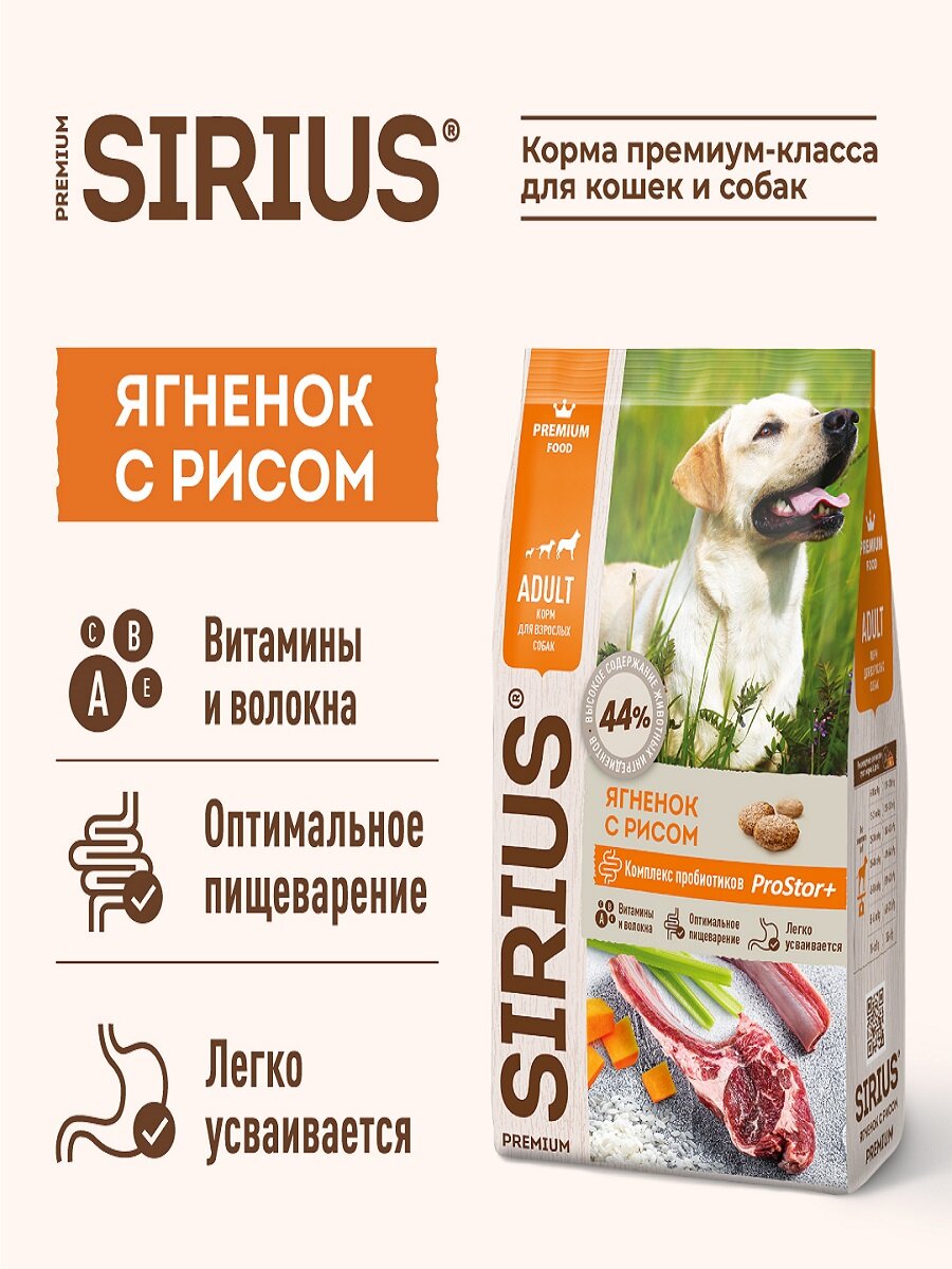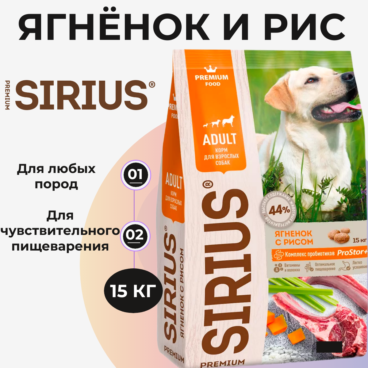 Корм премиум класса SIRIUS для взрослых собак Ягнёнок и рис 15 кг
