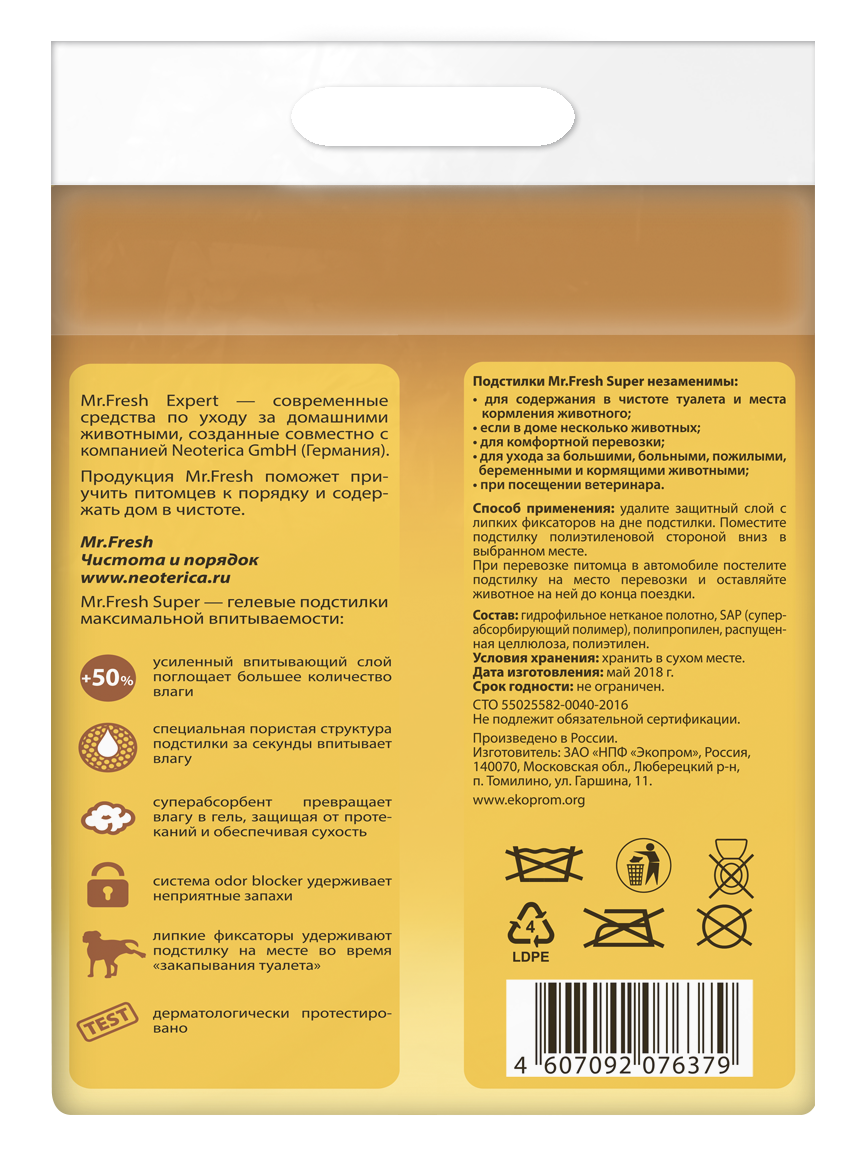 СохранитьЭкопром Mr.Fresh Подстилка-пеленка для кошек и собак Expert Super, впитывающая, 90*60см, 6 шт. 0.5 кг интересное: