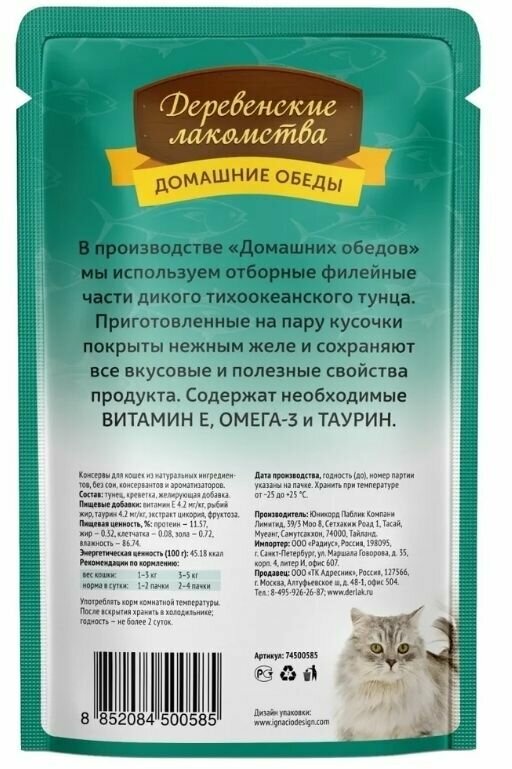 Корм для кошек деревенские лакомства Тунец с креветкой в нежном желе пауч 70г (упаковка - 12 шт)