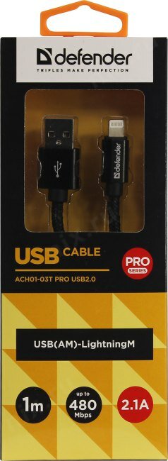 Кабель Defender ACH01-03T PRO USB(AM) - Lightning(M), для Apple, 2.1A output, в оплетке, 1м, черный ( Артикул 297725 )