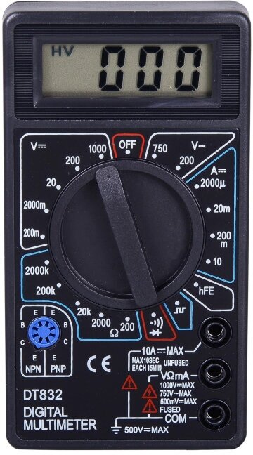 Мультиметр DT 832 широко используется как в домашнем хозяйстве и мастерских, так и в лабораториях. Он предназначен для измерений постоянного/переменного напряжения и тока, сопротивления, проверки диодов, транзисторов и звуковой прозвонки.