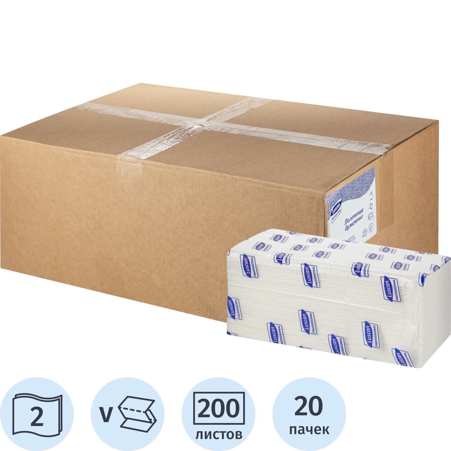 Купить Полотенца бумажные Luscan Professional для диспенсера, V-сложения, 2 слоя, белые, целлюлозные, 200 листов, 20 пачек
