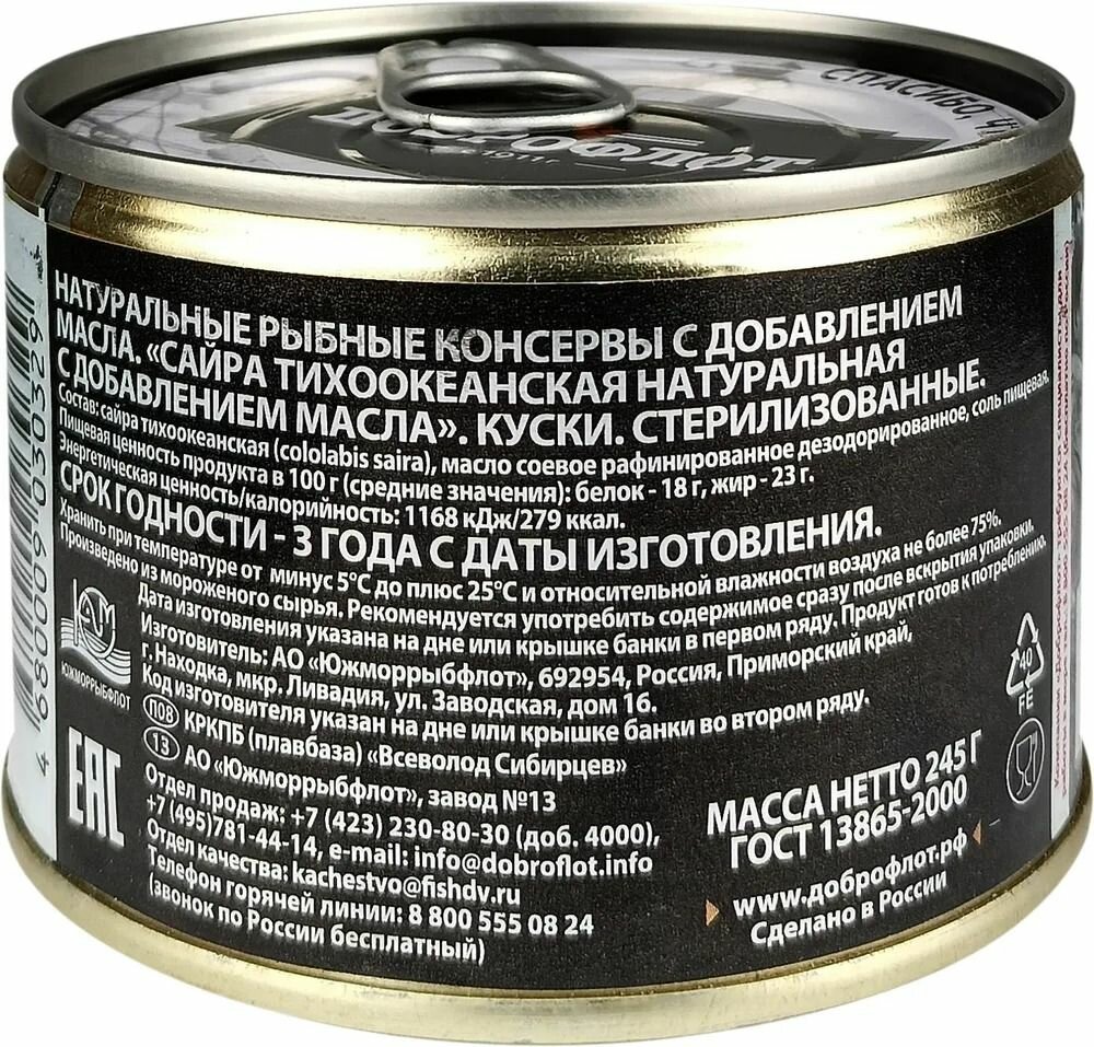 Консервы рыбные "Доброфлот" - Сайра натуральная с добавлением масла ГОСТ, 245 г