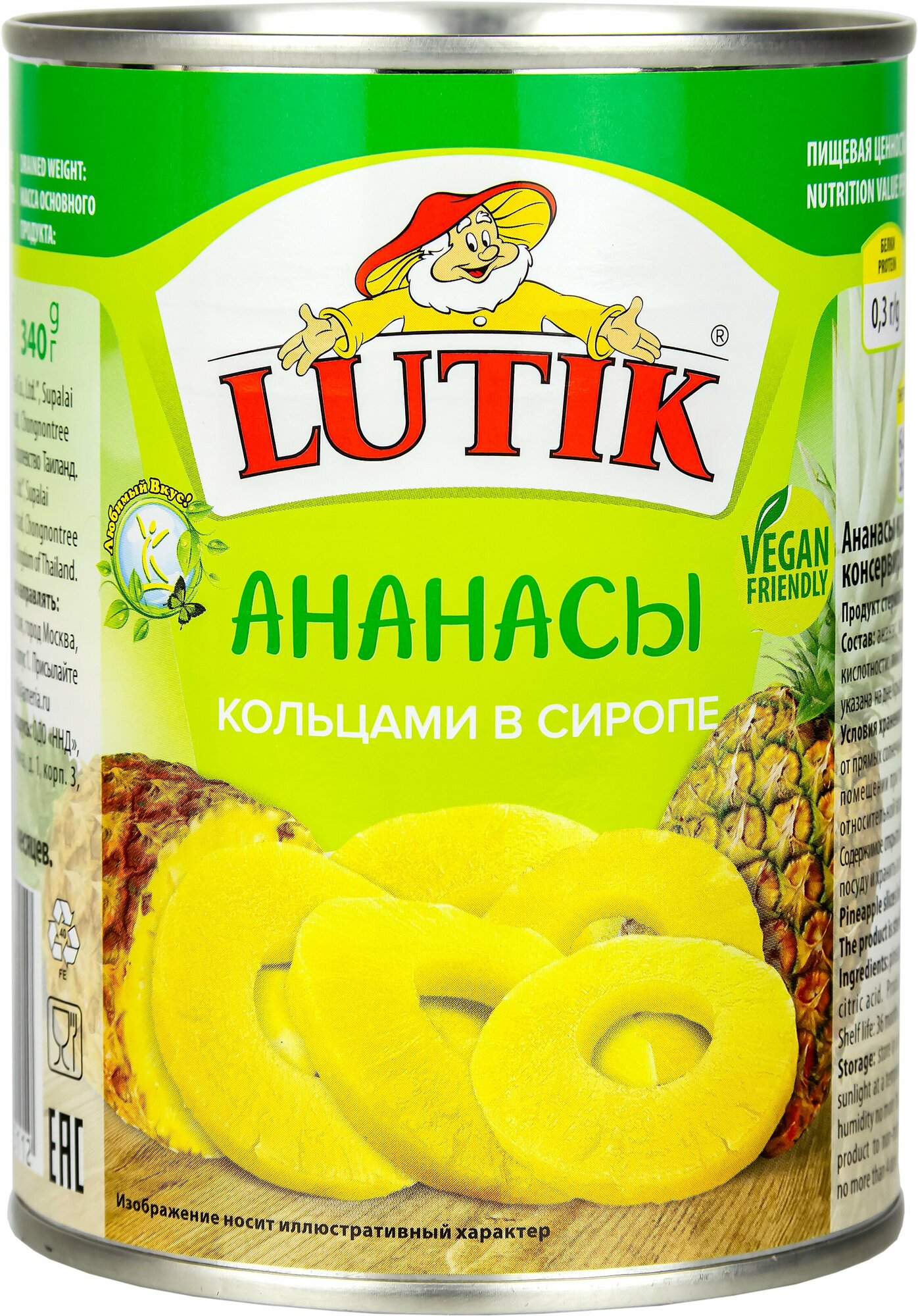 Консервированные ананасы Lutik кольцами в сиропе, жестяная банка, 560 г, 580 мл, 1 шт.