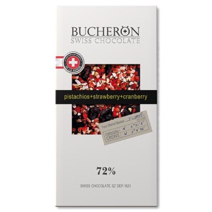 Купить Шоколад горький BUCHERON с клюквой, клубникой и фисташками, 100г