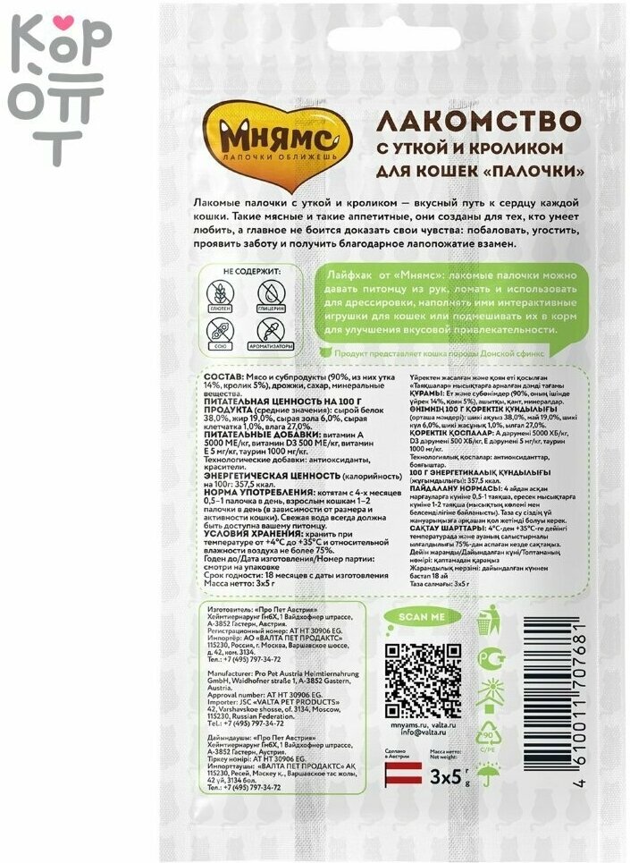 Мнямс лакомые палочки 13,5 см для кошек с уткой и кроликом 3х5 г NEW