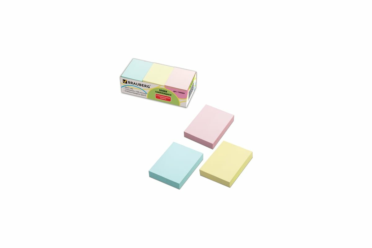 Блоки самоклеящиеся (стикеры) BRAUBERG, комплект 3 шт., пастельные 38х51 мм, 100 листов, набор 12 шт., 3 цвета, 126689