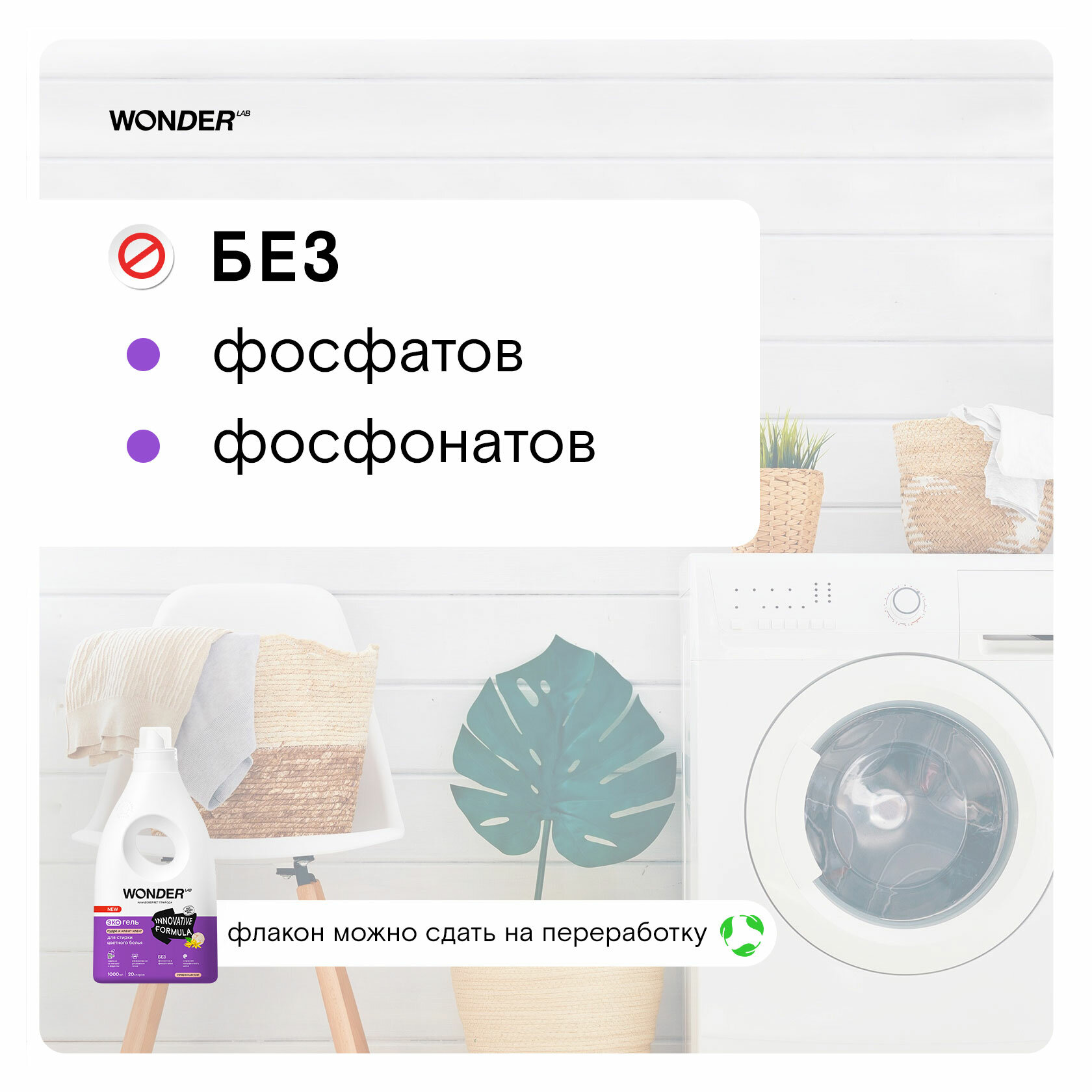 Эко гель для стирки цветного белья и одежды WONDER LAB, 1000 мл, гипоаллергенный гель с ароматом пудры и иланг-иланг