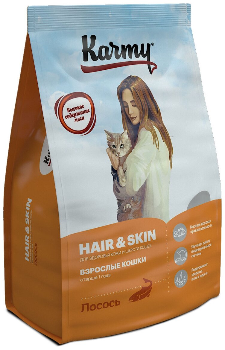 Сухой корм Karmy для кошек Hair&Skin, поддерживающий здоровье кожи и шерсти, лосось, 1,5 кг