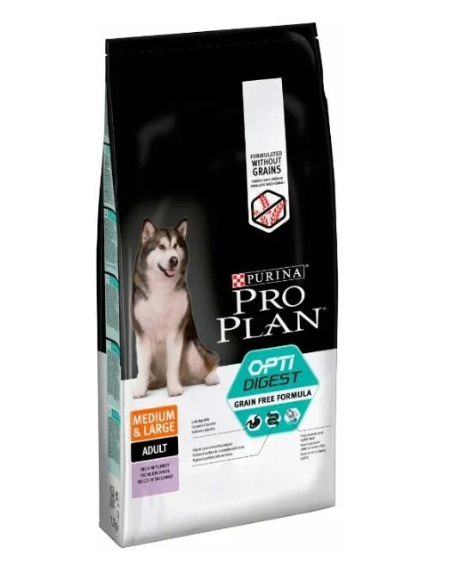 Pro Plan Grain Free Medium&Large корм для взрослых собак средних пород с чувствительным пищеварением Индейка, 12 кг.