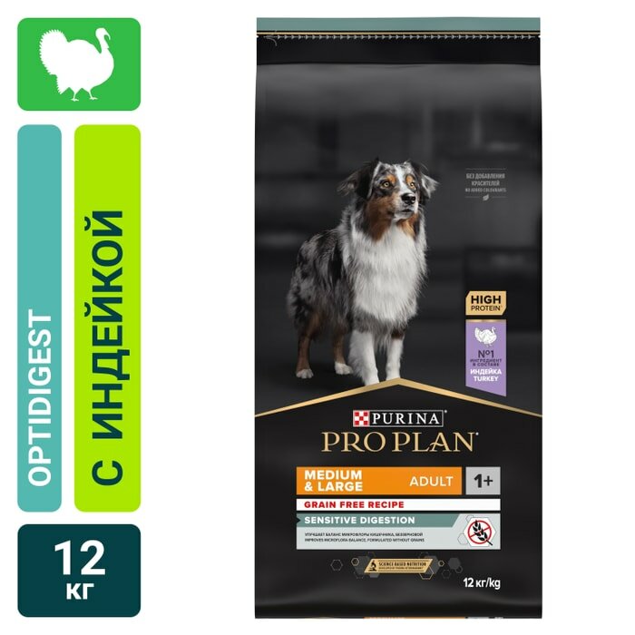 Сухой корм для собак Pro Plan Optidigest, беззерновой, при чувствительном пищеварении, индейка 12 кг (для средних и крупных пород)