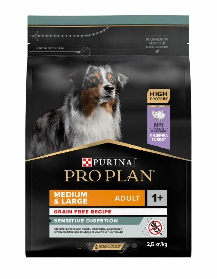 Сухой корм Pro Plan GrainFree (беззерновой) для взрослых собак средних пород с чувствительным пищеварением с индейкой пакет 2,5кг, для взрослых собак средних пород