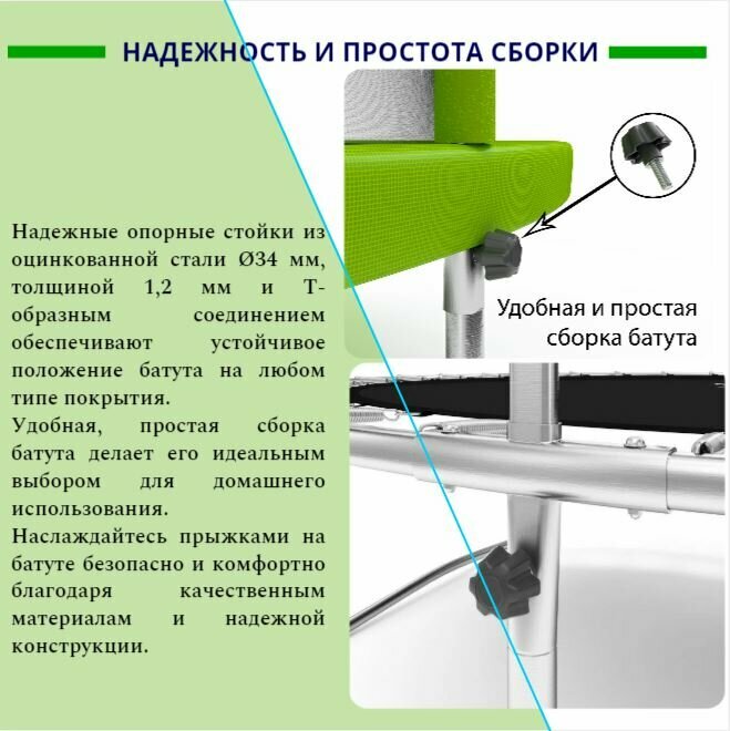 | Плюсы: | Если удалось собрать, получается совершенно изумительный батут. "П" образные ножки очень помогают если он стоит не на асфальте а, допустим, на газоне. Сетка внутри пружин - это правильно, хотя и кажется что это уменьшает площадь. |