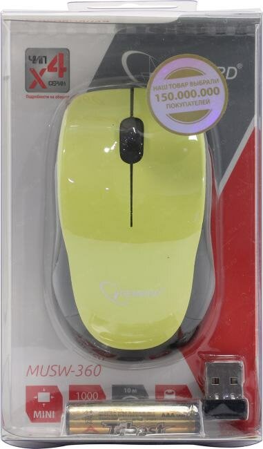 Мышь беспроводная Gembird MUSW-360-LM, 2.4 ГГц, лазерный лимон, 2 кнопки+колесо-кнопка, 1000 DPI, батарейки в комплекте