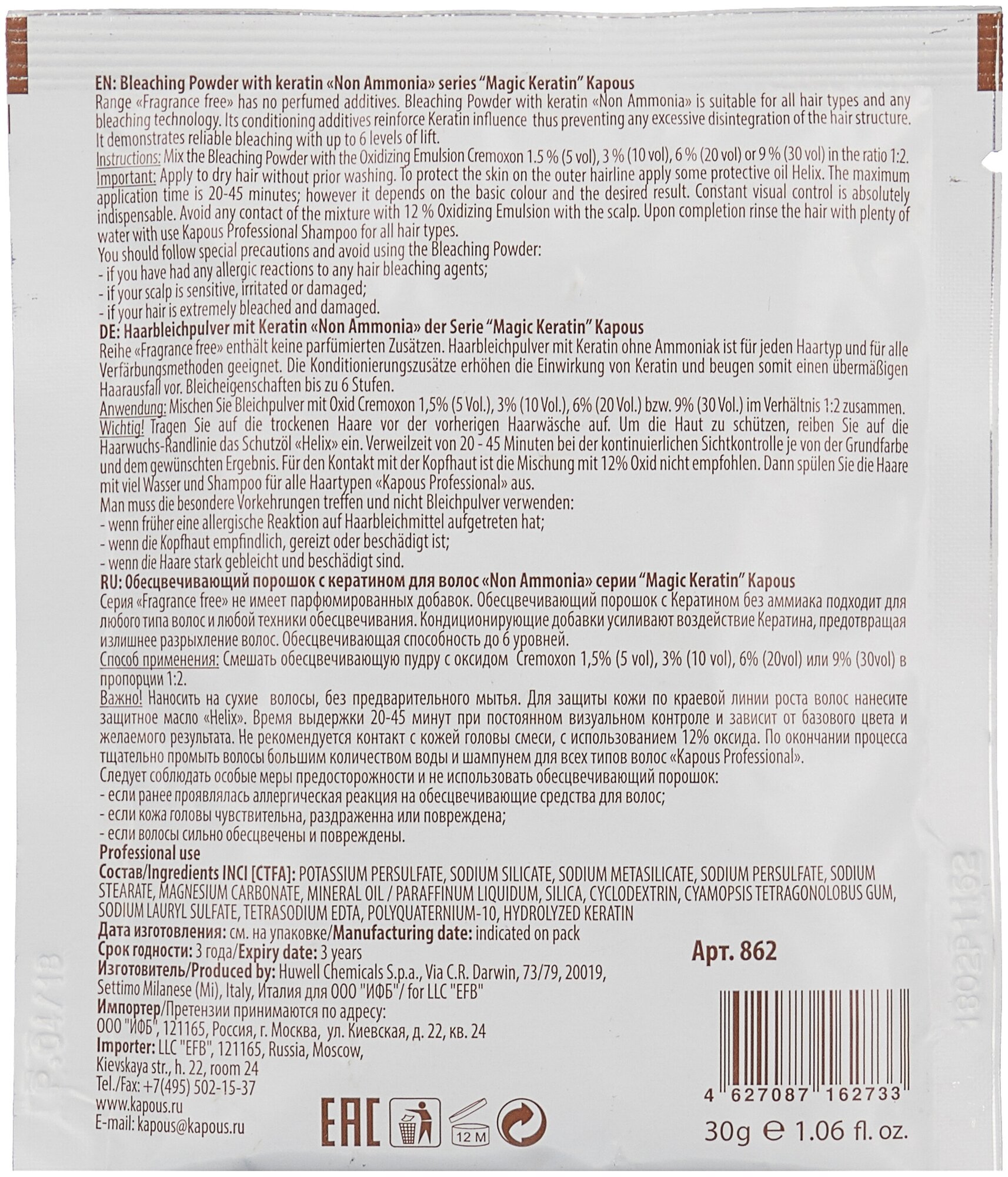 862 Kapous Пудра осветляющая в микрогранулах non ammonia "Magic Keratin" 30 г