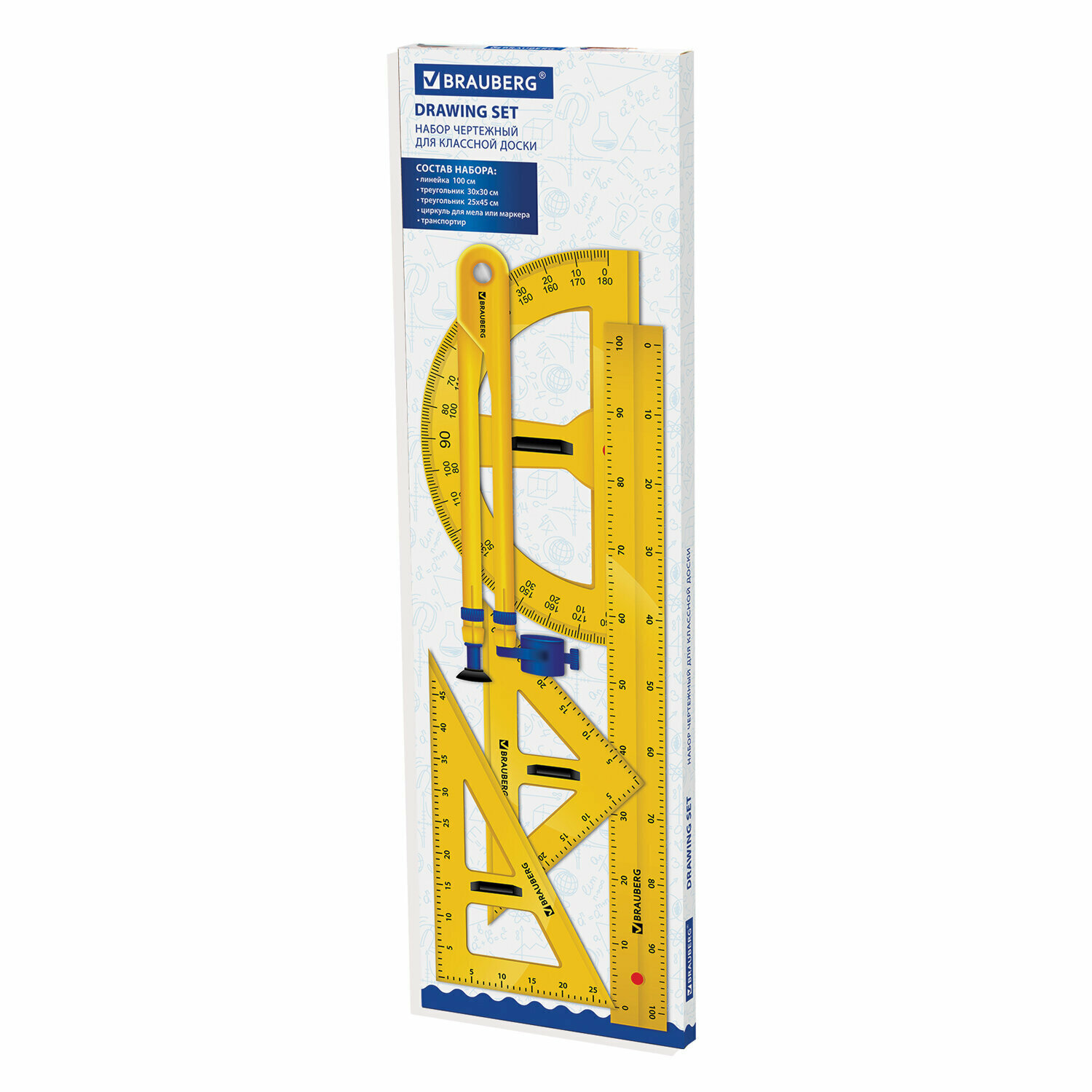 Набор чертежный Brauberg для классной доски (2 треугольника, транспортир, циркуль, линейка 100 см) (210383)