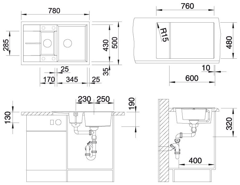 | Плюсы: | Две чаши, сушка под уклоном (вода не скапливается под посудой, т.к. в сушке есть желобок для оттока воды), клапан автомат (установили на большую чашу, на маленькой - полуавтомат) |