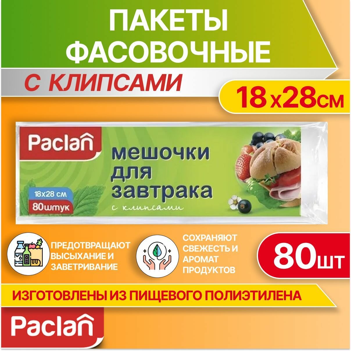 Пакеты фасовочные для завтрака и продуктов, 80 шт, 18 х 28 см, Paclan