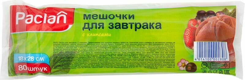 Пакеты для завтрака для замораживания Paclan, 0.28, 10 мкм х 18 см, 1 л, 80 шт.