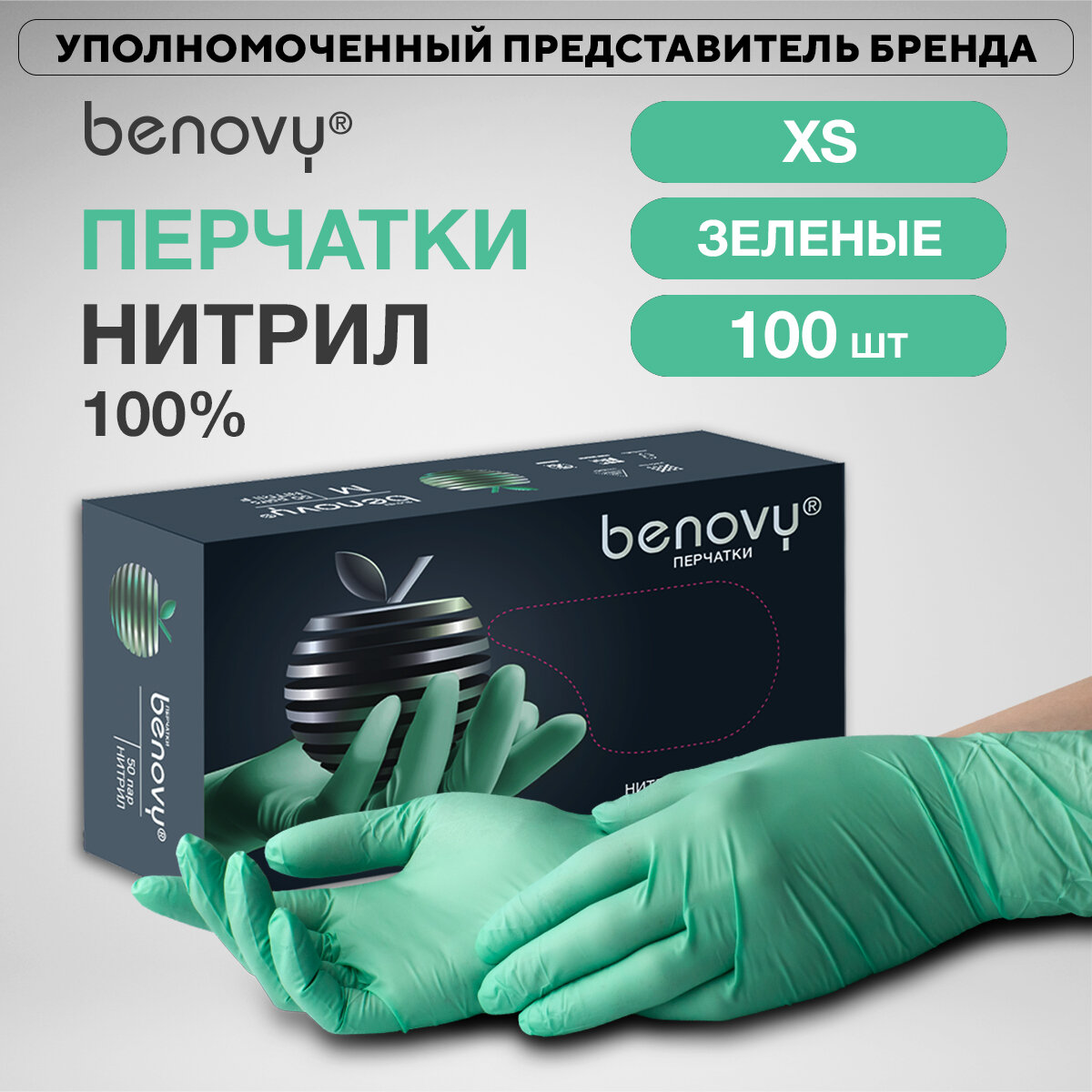 Перчатки нитриловые S текстурированные на пальцах BENOVY зеленый (50 пар)