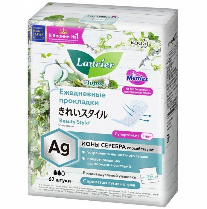 Прокладки ежедневные Laurier Beauty Style, с ионами серебра, Fresh, с ароматом луговых трав, 62 штуки (558628 / 552547)