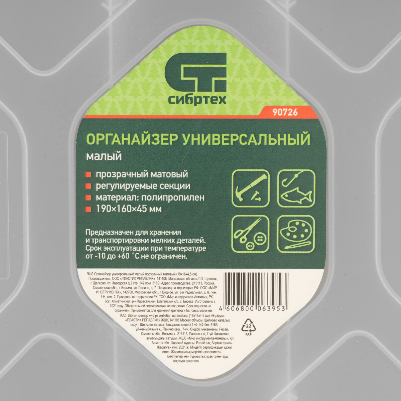 Органайзер универсальный малый. прозрачный матовый 19 х 16 х 4.5 см Сибртех EAN-13: 4606800063953
