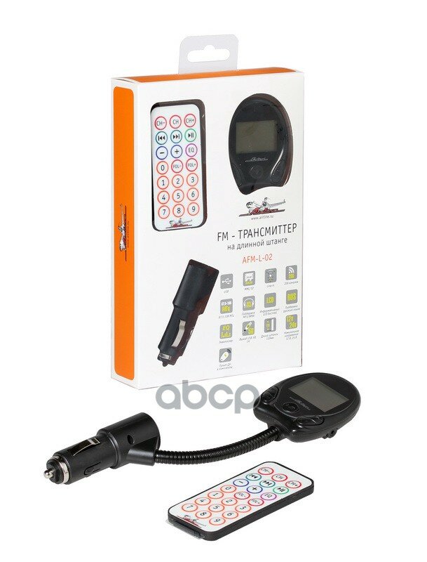 FM-модулятор (трансмиттер) Airline AFM-L-02, 12/24В, LCD дисплей, 2xUSB (2.1А), microSD, пульт ДУ в комплекте, на длинной гибкой штанге