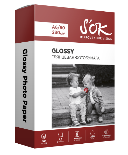 Фотобумага S’ok S'OK глянцевая, формат А6, плотность 230г/м2, 50 листов