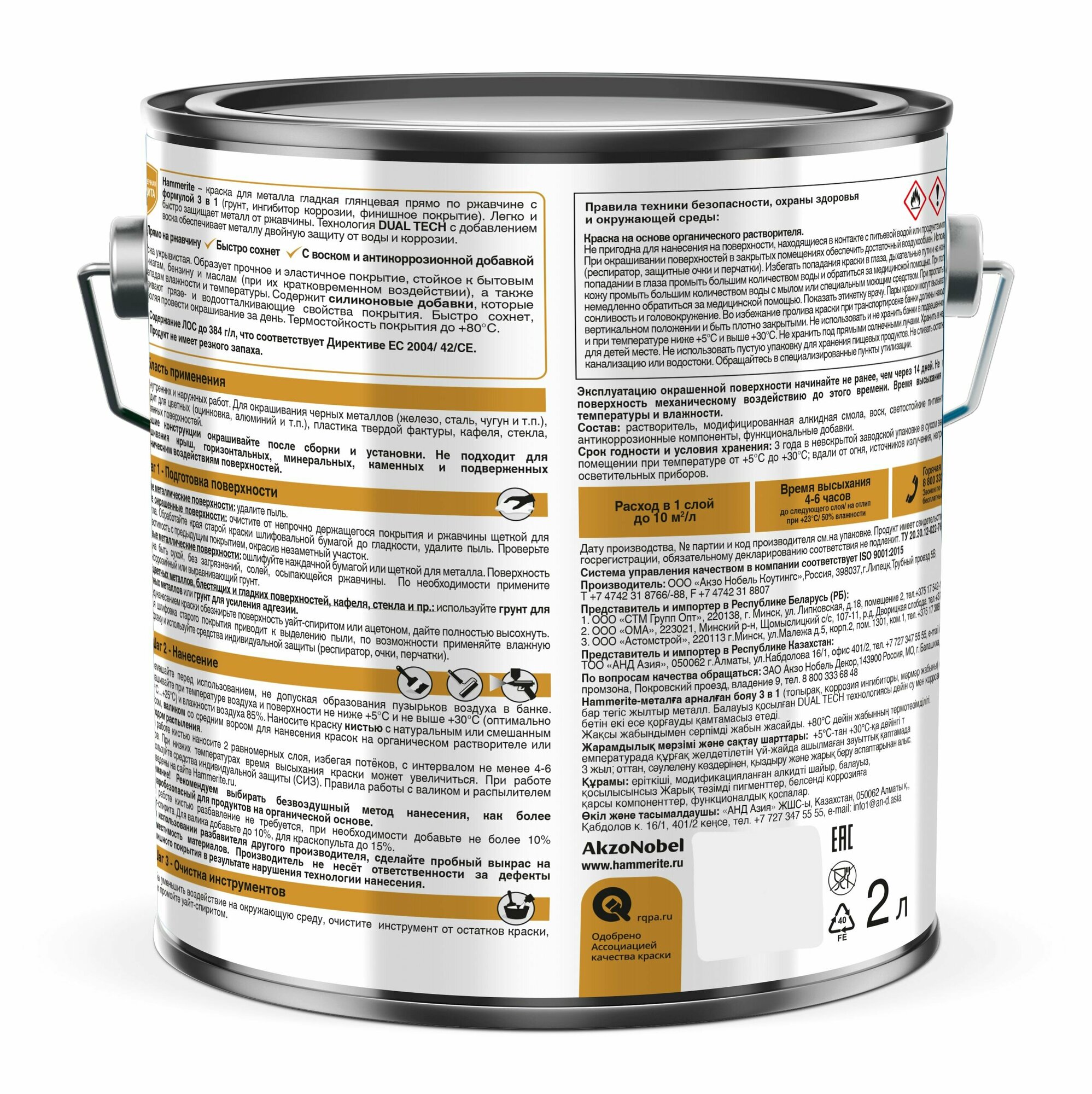 Краска для металла 3 в 1 прямо на ржавчину Hammerite гладкая глянцевая (2л) серый RAL 7042