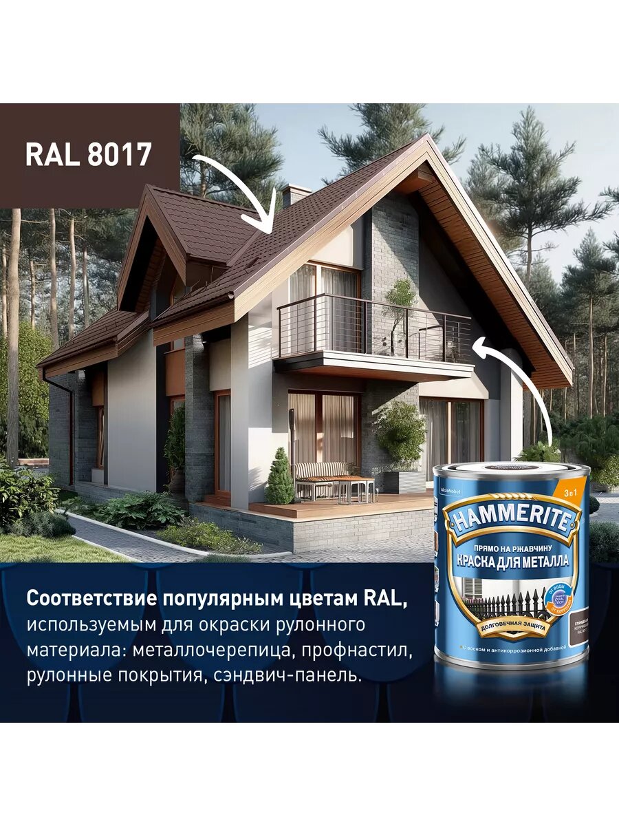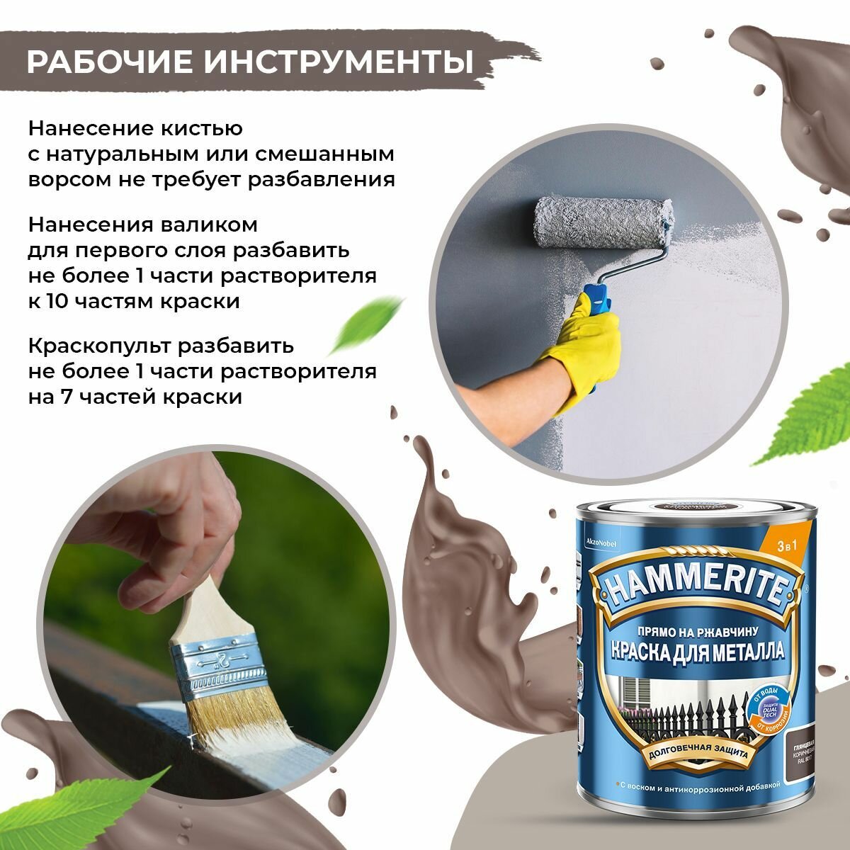 Краска для металла 3 в 1 прямо на ржавчину Hammerite молотковая (5л) коричневый RAL8017