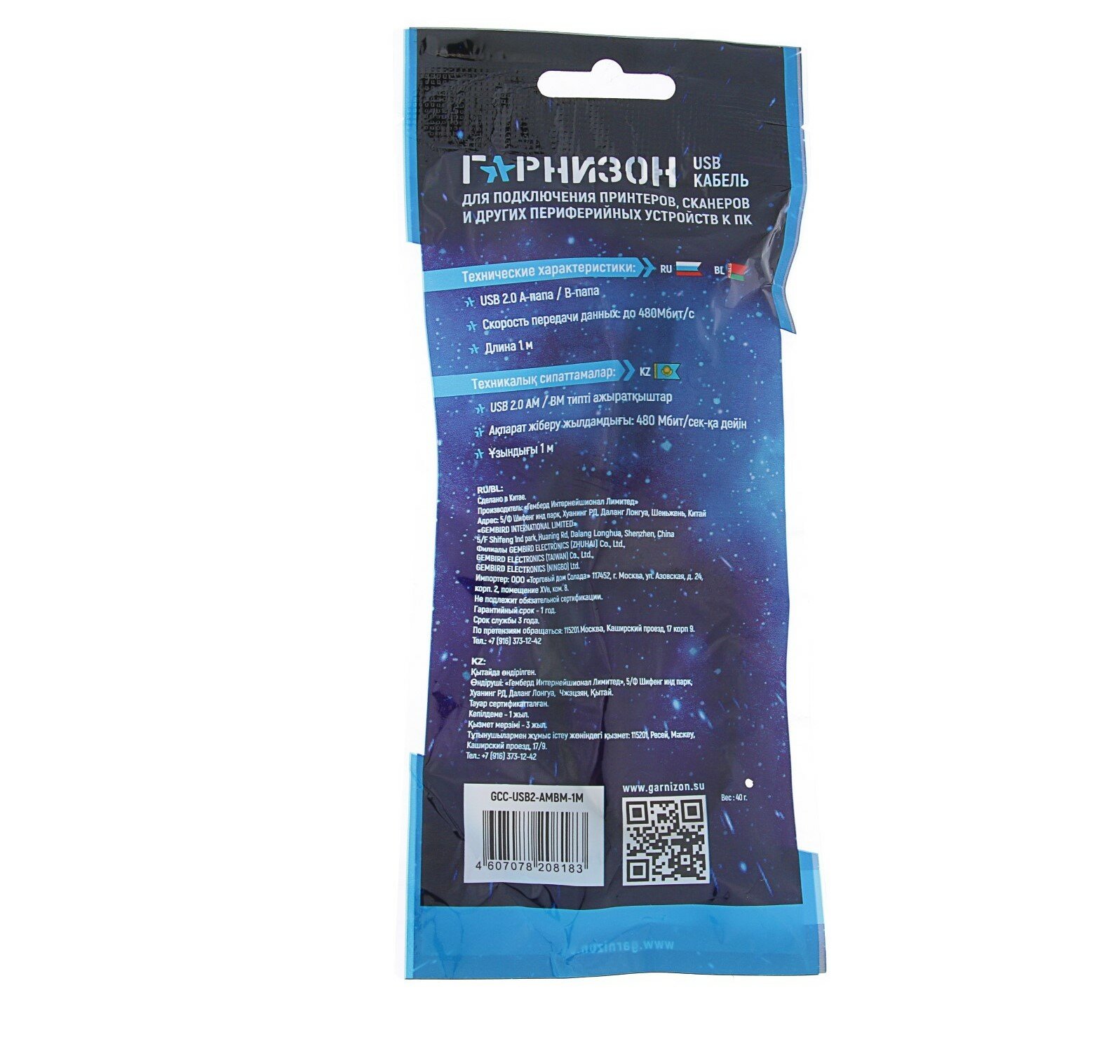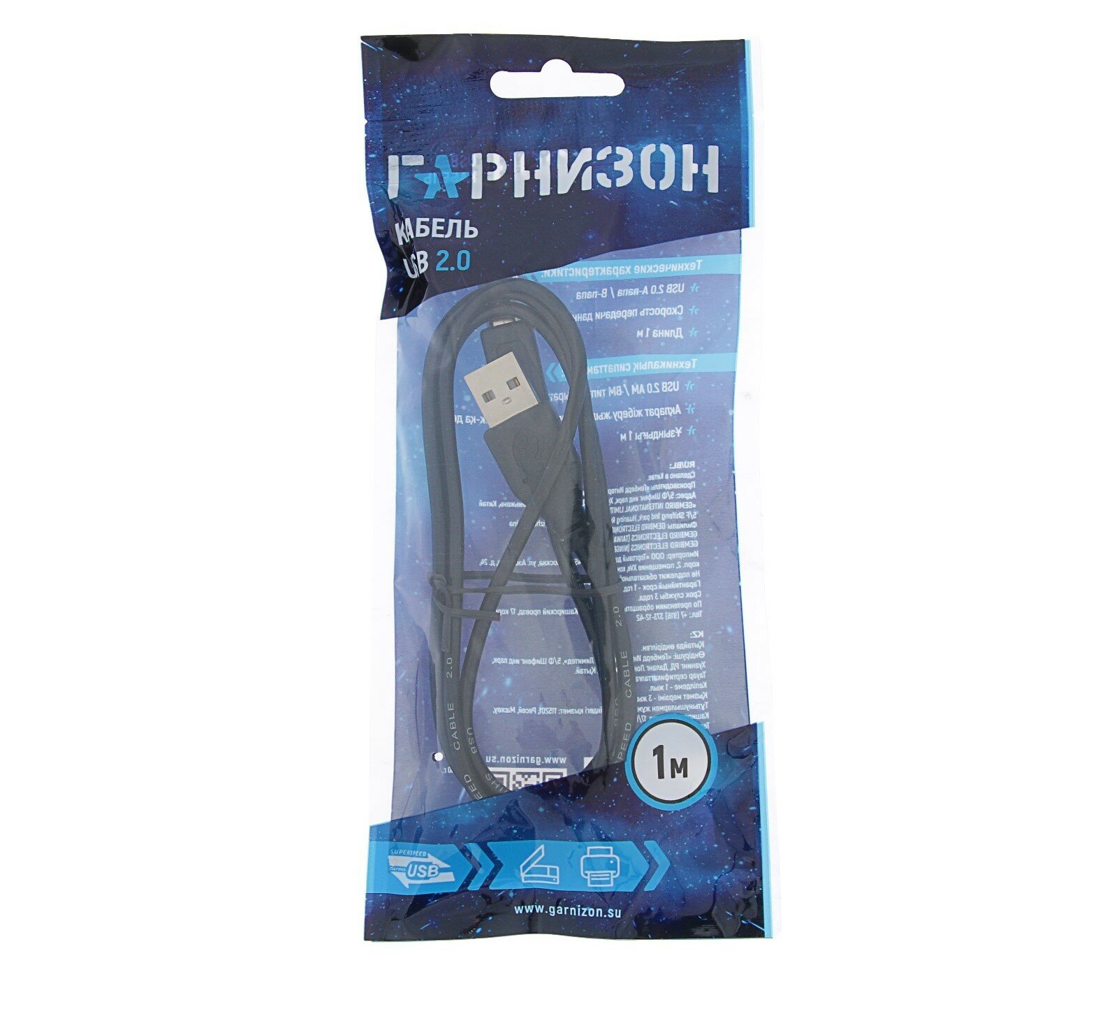 Кабель интерфейсный USB 2.0 Garnizon AM/BM 1 м, пакет