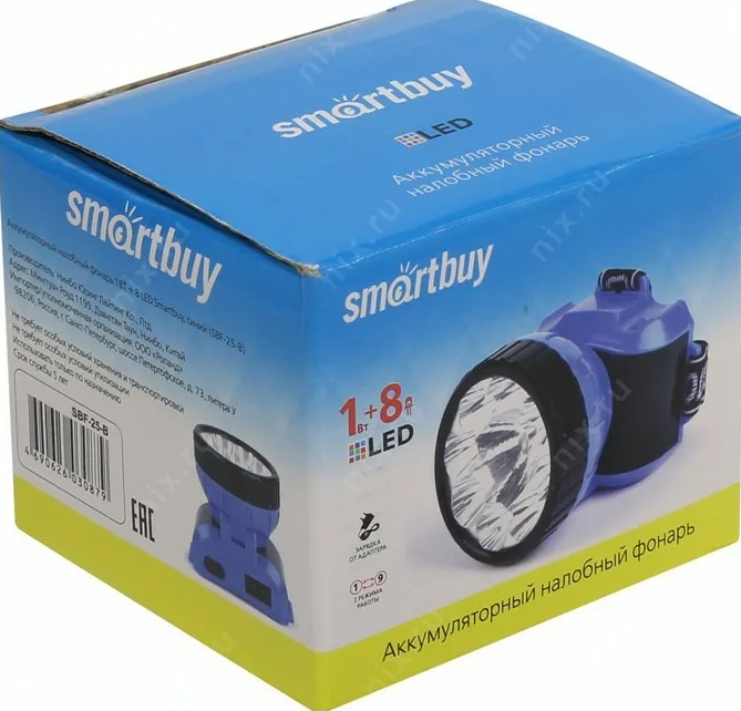 Купить Smartbuy фонарь налобный (акк. 4V 0.5 Ah) 1св/д 1W+8св/д, синий/пластик, 2 режима, з/у 220V SBF-25-B