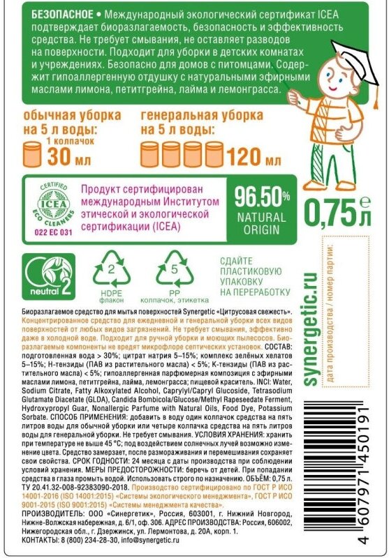 Средство для мытья пола и поверхностей Synergetic Цитрусовая свежесть 0,75л 4607971450191