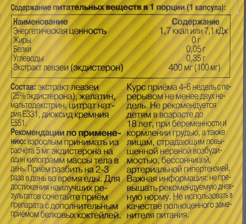 | Минусы: | Низкое качество, в идеале продукт должен быть чище и иметь 95+% экдистерона