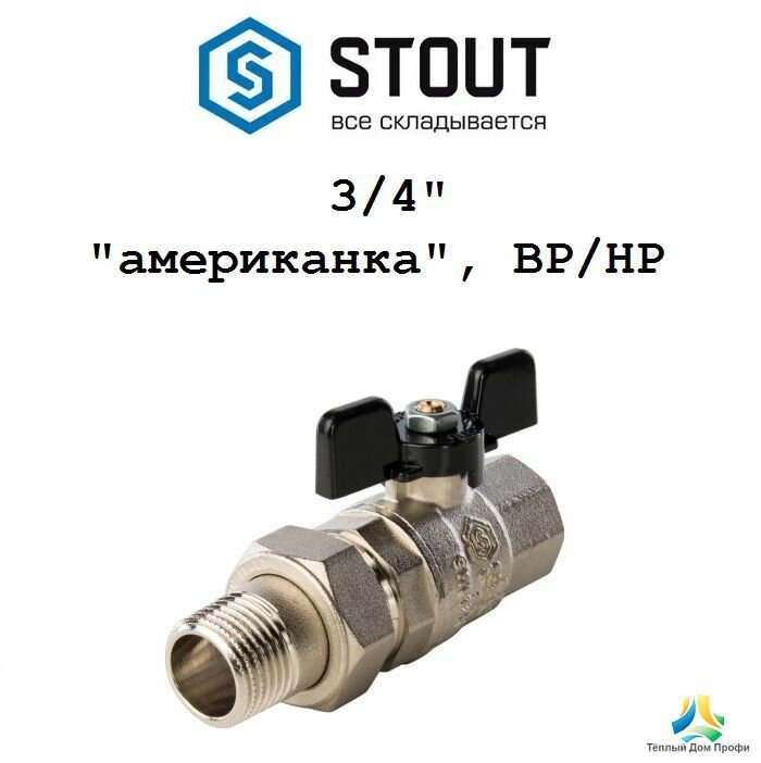STOUT Кран шаровой полнопроходной с "американкой", ВР/НР, ручка бабочка 1