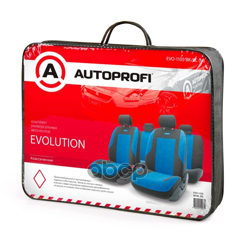 AUTOPROFI Авточехлы EVOLUTION, велюр, 11 предм., карман, 3 молнии чёрн./синий, разм. М EVO-1105 BK/BL (M) интересное: