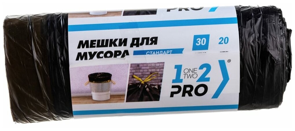 1-2-Pro Мешки д/мусора 30 л ПНД с завязками черный 14 мкм 50х55см 20 шт/рул. 1-2-PRO ММЗН03014-20