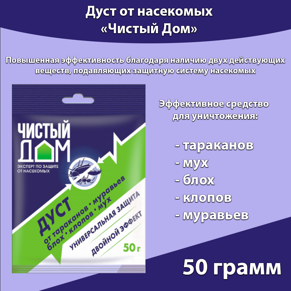 Чистый дом, дуст от тараканов, муравьев, блох, клопов, мух, 50 грамм