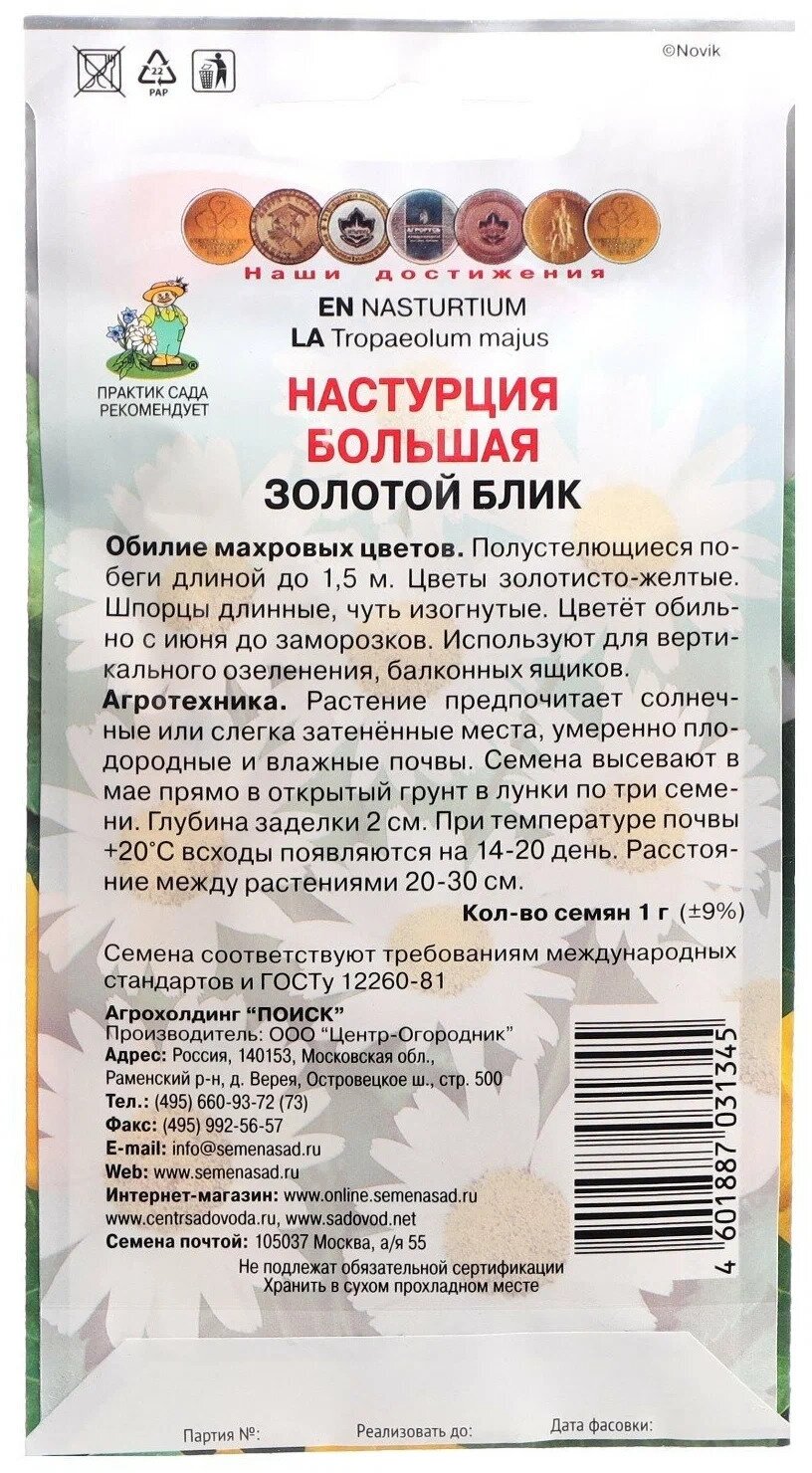 СохранитьСемена цветов Настурция "Поиск", большая, "Золотой блик", однолетник, 1 г интересное: